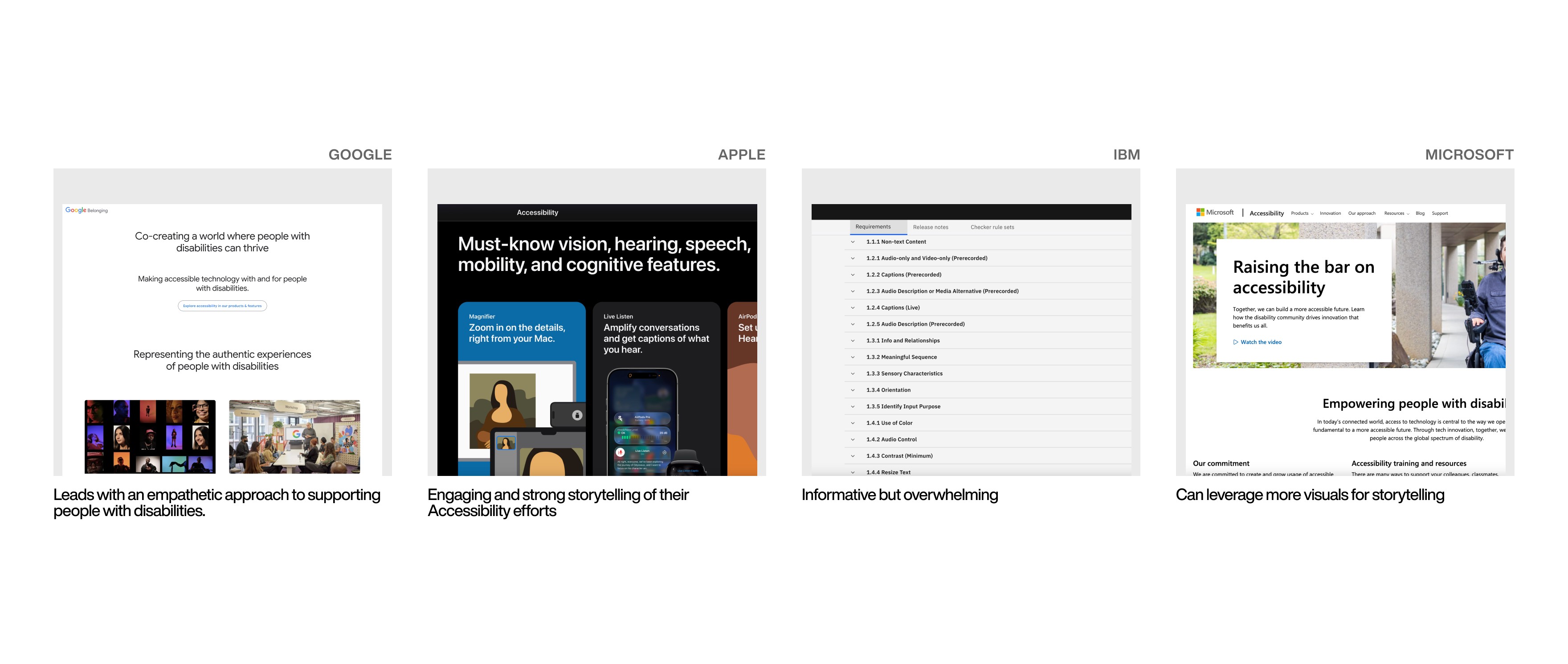 Given the timeframe that we had ~2 months to get designs rolling, majority of our research was based on determining the content we want to display which is shaped by the accessibility team's decision as well as shaped later by the legal team on what can or can not be shared publicly. I did research across various web platforms including Microsoft, Google, etc. to understand how they share about their accessibility efforts.