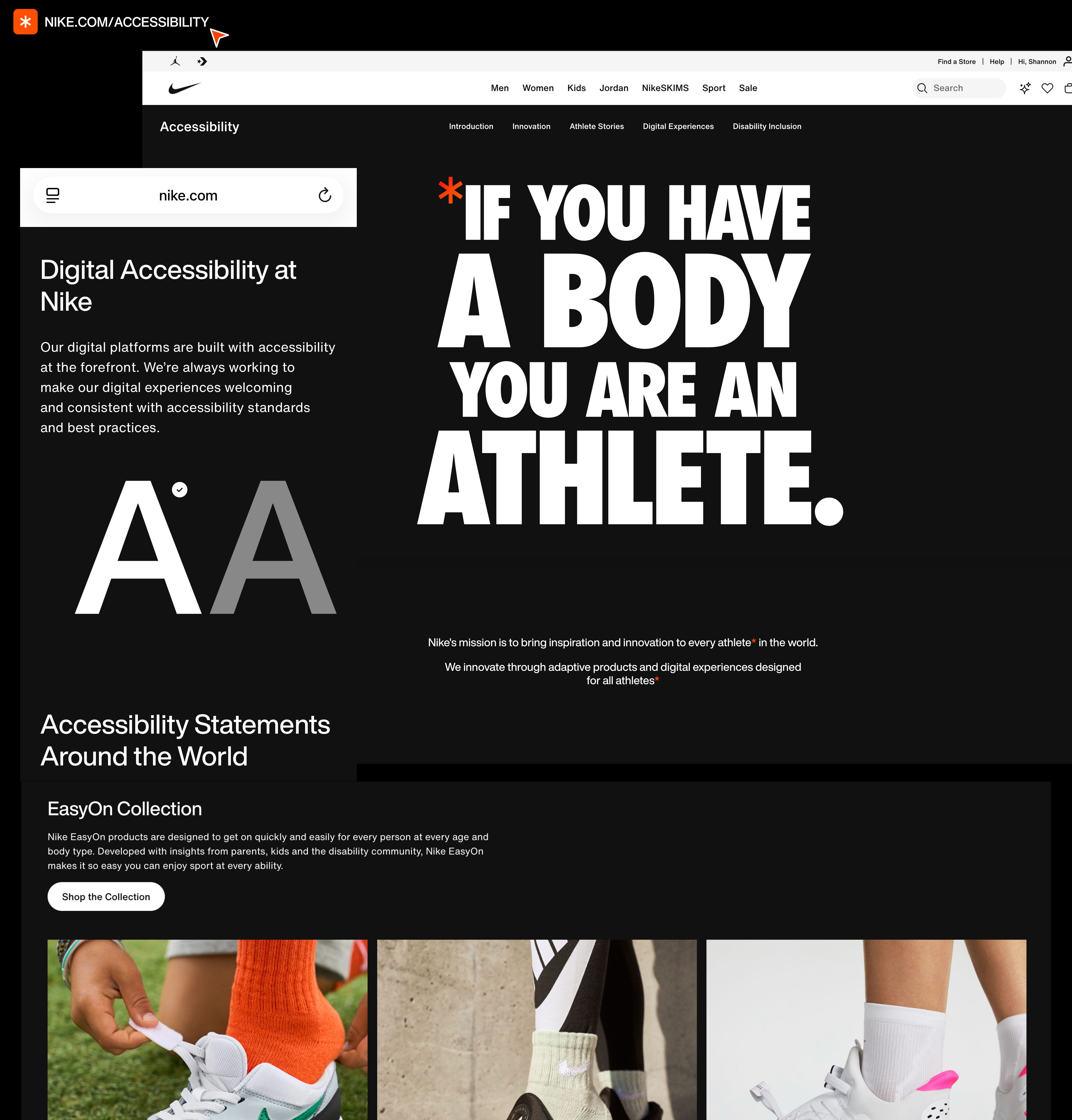 Nike has worked on many efforts including but not limited to their production of Easy On (adaptive footwear), sponsorship of multiple adaptive athletes, established & continuously support the employee disability network, integrate digital accessibility efforts across their digital products & ecosystem.